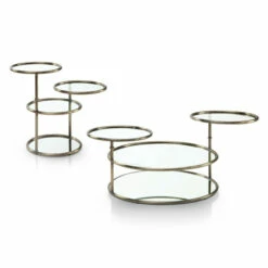 Choose the charming Hora modern two-piece swivel accent table set to anchor an upbeat modern space. From Furniture of America, this delightful table set runs rings around the competition with attention to shape and finish. Floating shelves made from clear tempered glass offer plenty of room for serving and display, as lower shelves made from mirrored glass reflects its upper design and delivers a dimensional quality. Rimmed with rounded champagne finish metal frames, they offer a compelling, versatile vibe. Each table’s top two shelves swivel to offer a perfect position for entertaining.
