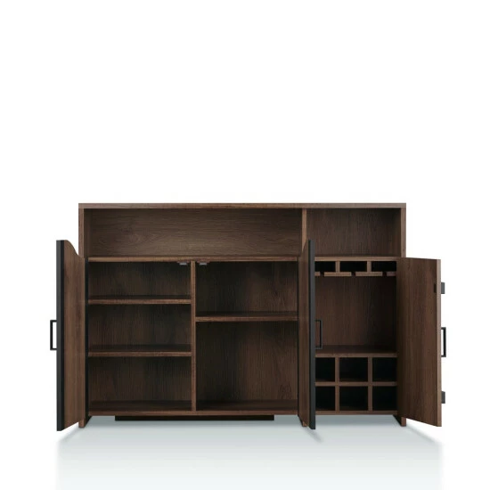 This 47-inch rustic walnut buffet server offers a wholesome, earthy dining room energy. Curved, gate-inspired doors and a paneled design add to the country-inspired look, as two open shelves accompany five adjustable shelves inside the spacious cabinet and a sleek black finish tops off metallic accents.