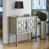 - Gate-inspired cabinet door opens to 5 adjustable shelves