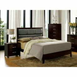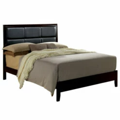 Free your bedroom from the ordinary and take it up a notch to the extraordinary. This modern panel bed is an inspiring piece that will offer comfort and style. The silhouette is crisp and clean for a look of no-nonsense glamour that blends beautifully with a variety of decor styles. The faux leather headboard is comfortably padded, allowing it to double as a backrest. Elegant tufting adds just the right hint of sophistication, while the sleek framework makes it easy to climb into bed. Finished in deep, rich espresso, this beautiful bed comes in your choice of California king, Eastern king, queen or full to fit effortlessly into bedrooms of all sizes.