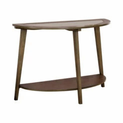 Casual elegance gains sophistication for a perfectly transitional motif, making the Hula oak semi-round sofa table from Furniture of America a great find. Its Mid-Century Modern design incorporates Swedish Modern styling principles, lending a sophisticated touch with laid-back, carefree ambiance. A dark oak finish over solid wood and wood veneer construction renders this sofa table versatile and warm, as an angled silhouette places tapered, splayed legs in a position to hug a sleek half-moon shaped lower shelf. Add a tempered glass insert into its tabletop, and your glam factor inches up. Natural woodgrain accents complete the earthy feel of a table that moves from a casual family entertaining space to a semi-formal living room.
