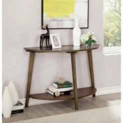 Casual elegance gains sophistication for a perfectly transitional motif, making the Hula oak semi-round sofa table from Furniture of America a great find. Its Mid-Century Modern design incorporates Swedish Modern styling principles, lending a sophisticated touch with laid-back, carefree ambiance. A dark oak finish over solid wood and wood veneer construction renders this sofa table versatile and warm, as an angled silhouette places tapered, splayed legs in a position to hug a sleek half-moon shaped lower shelf. Add a tempered glass insert into its tabletop, and your glam factor inches up. Natural woodgrain accents complete the earthy feel of a table that moves from a casual family entertaining space to a semi-formal living room.