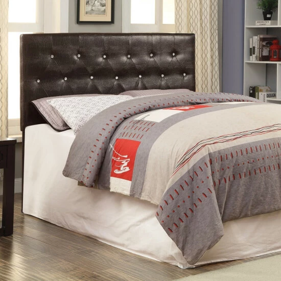 Wrapped in a crocodile textured, faux leather upholstery, complete with glimmering acrylic button-tufting and diamond stitching, the foam-filled headboard provides proper, comfortable back support, while your choice of three gorgeous finishes tops off the look.