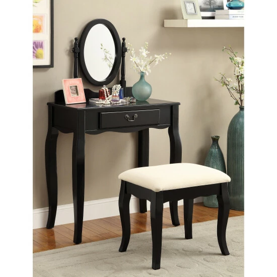 Be entranced in the fanciful world of hair and make-up with this gorgeous vanity and stool set that showcases scalloped detailing, antique hardware, and cabriole-style legs. These delicate features are paired with an oval mirror and single drawer to provide just what you need when beautifying!