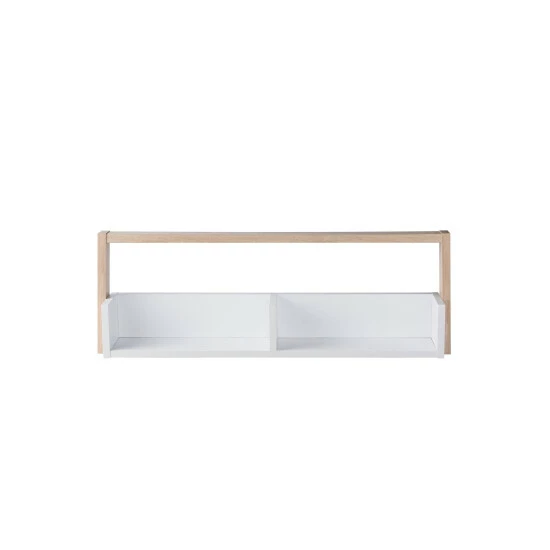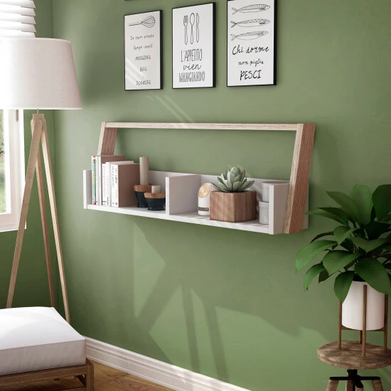 A modern apartment is an attraction to the minimalist as it offers a neat look with clean-cut corners and unbiased colors. Every furnishing is perfectly placed to create a balanced atmosphere. This two-toned floating console is a minimalist style that will fill those empty spaces on the wall. The floating design gives a living room a spruced look. Liven up the room by displaying accent decor on the shelf. Or, exhibit your collection of inspiring publishings on the likes of business and economics. For more practical use the shelf will also support all your video-games. Front-facing, the console has authoritarian vertical and horizontal lines. But, at a side view, you’ll be gallantly taken by the creative slant. It offers two shelves without intruding on floor space. Select between a white and distressed grey or a white and natural finish. Cam locks and bolts fasten joints and allow prompt assembly with easy connection.