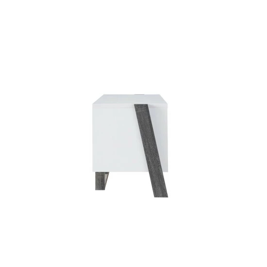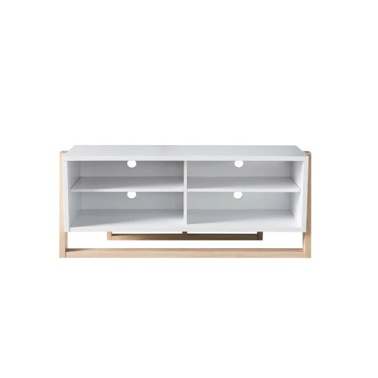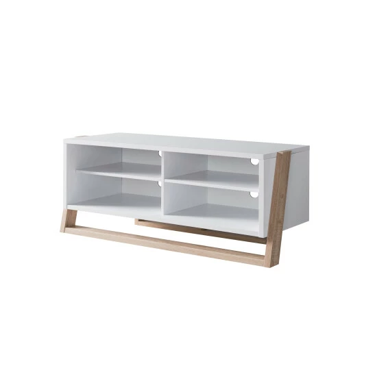 A modern home appeals to the minimalist as it offers a clean look with crisp cut edges and neutral tones that don’t overcome the atmosphere of a space. This large two-toned TV stand is a modern design with a stylish slant front base leg. This scheme gives the TV console a sleek look. Front-facing, the stand has strict vertical and horizontal lines. But, at an angle, you’ll be pleasantly surprised with a creative alignment. It extends four shelves, each with wire holes for seamless cable organization for your router, modem, cable box, and gaming console. Pick between a white and distressed grey or a white and natural finish. Cam locks and bolts secure joints and allow quick assembly with easy fastening. Included shelf pins allow you to arrange the height of the storage to your preference. The base is accompanied by nail-on foot pads to protect the floor when gliding the furniture in its place.
