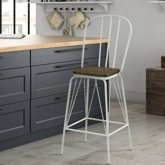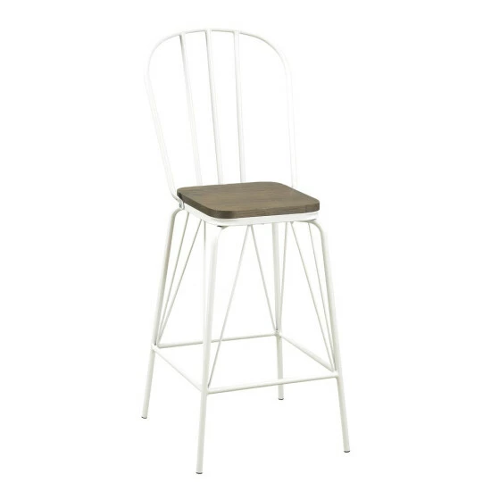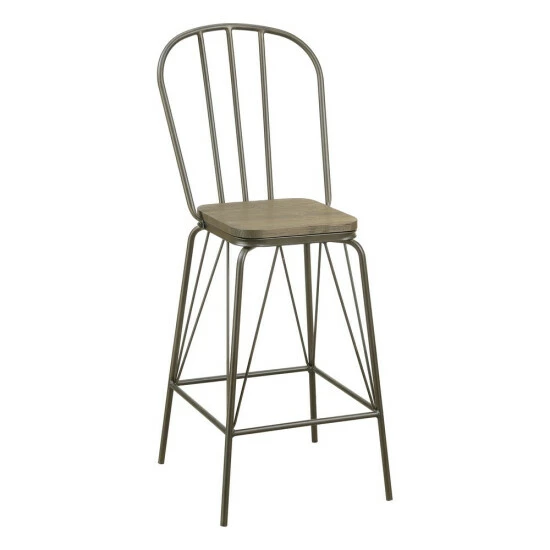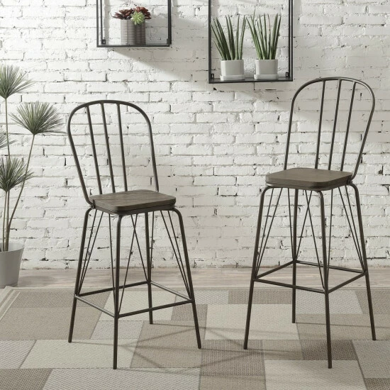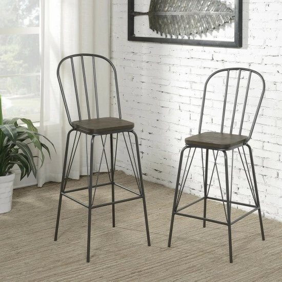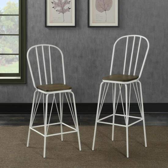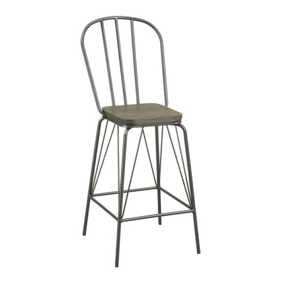 A combination of materials, tones, and styles highlights the design of this set of two industrial counter-height chairs from Furniture of America. The feature sturdy wood and metal construction in a two-tone finish that brightens any home. Each chair features a smooth seat and sleek spindle back design that’s a feast for the eyes. The wiry legs include footrests and also feature sleek metal support wires. These chairs designed for use at a kitchen counter or counter-height dining table, yet can be pulled up to a home bar, offering a sleek modern industrial look with rustic touches that you’ll enjoy for years to come.