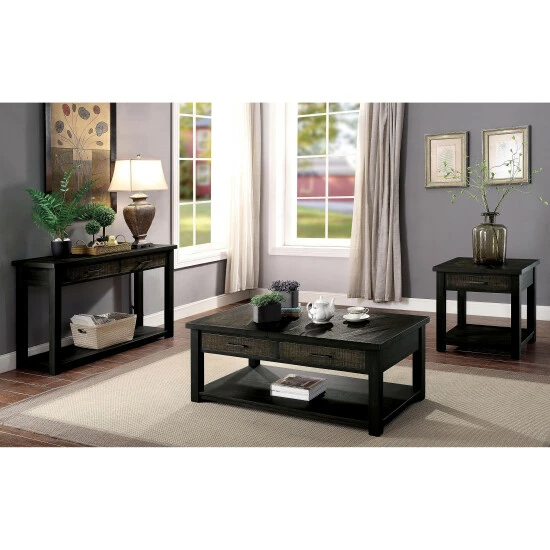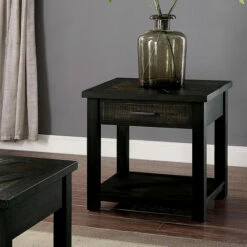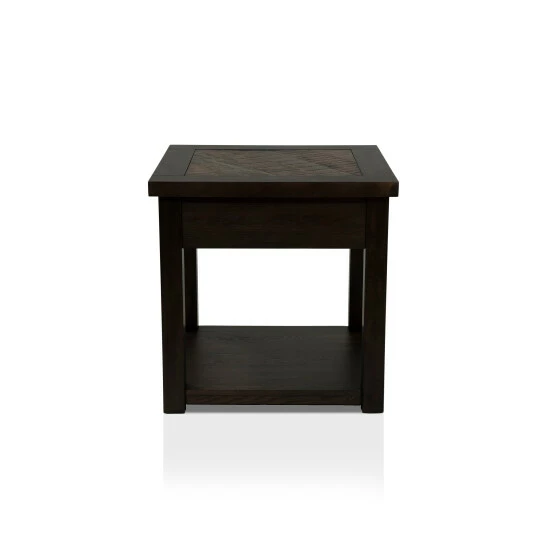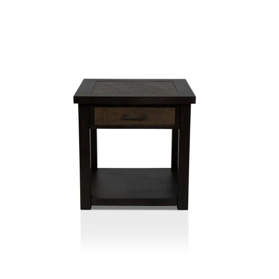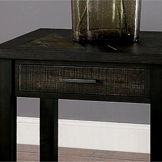 A dramatic finish and classic lines define the beautiful design of this wood end table from Furniture of America. The Jacob transitional wood end table puts wood aesthetics to good use with a sturdy build of solid wood and wood veneers and a tempting dark oak finish. A unique diagonal plank-style top adds character and style with rustic ambiance. This table reflects a design with clean lines, featuring an overhang top surface and a convenient lower shelf offering extra space for display. A spacious storage drawer operates smoothly, making room for hiding incidentals. Natural etched accents set its drawer apart from the table frame, delivering a two-tone effect.
