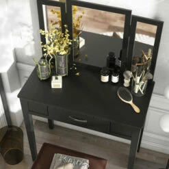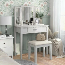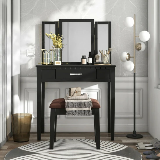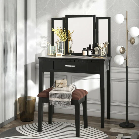 Set off your bathroom or bedroom with this contemporary vanity set. Showcasing a tri-fold mirror and spacious table top, this vanity features a roomy drawer to store jewelry, makeup, tools, and more.