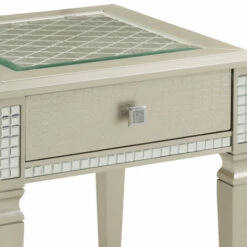 Anchor your abode with this luxurious three-piece table set from the Jaegersmorr collection. From the glamorous mirror inserts on each table corner to the crocodile-esque texturing that adorns each of the included side-panels, these items bring flare to any room. Invite some Hollywood, glam aesthetic into your life. Transitional storage drawers mean there’s no need to sacrifice practicality for elegance.