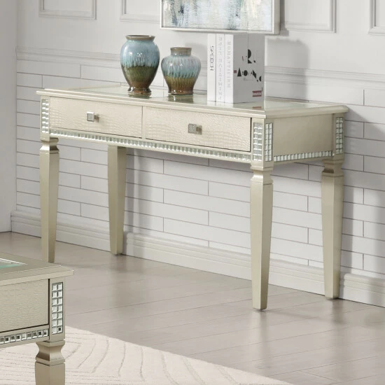 Anchor your abode with this luxurious sofa table from the Jaegersmorr collection. From the glamorous mirror inserts on each table corner to the crocodile-esque texturing that adorns each of the included side-panels, this item brings flare to any room. Invite some Hollywood, glam aesthetic into your life. Transitional storage drawers mean there’s no need to sacrifice practicality for elegance.