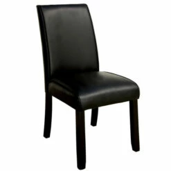Simple elegance creates a compelling look in a modern or transitional space with this set of two sophisticated contemporary dining chairs. The Jared dining chair from Furniture of America delivers a streamlined silhouette with updated appeal. A Parson-style design features a subtly curved back and back legs, with tapered front legs. A bold black finish wood and wood veneer frame hosts a seating unit wrapped in smooth black faux leather. A plush foam fill and novel tucked side design offers ultimate seating comfort and accented design appeal. This chair is a perfect addition to modern or transitional dining ensembles and yields hours of sheer seating comfort.