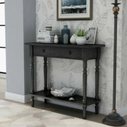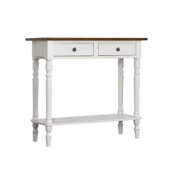 This Furniture of America Jeln Traditional Wood Entryway Console Table gives you storage in tight spaces with it’s great design. At a slim 13 inches deep. this hallway table can fit in many small areas including a master bath or an entryway nook. Its two drawers provide plenty of space for stashing small accessories like a remote control, your car keys, or even personal grooming items. The console is complete with a wide top an open lower shelf that create ample opportunity for easy display of everything from a vase of flowers to a set of framed photos. The console is designed with a traditional country frame, complete with turned carved legs and metal hardware.