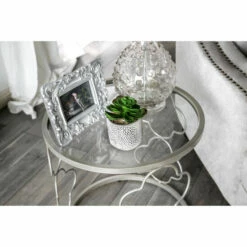 A tale of delicate artistic design plays out in a contemporary living space when the Jenn modern round metal end table serves as a central focus. From Furniture of America, this delightful end table becomes a primary decor feature with its charming style and light essence. Enjoy a novel round silhouette in a sturdy frame fashioned from light champagne finish metal. Panels of open metalwork forming quatrefoil elements join the round tabletop and open base, creating just enough airy, open space to make a room look larger. A sheet of strong, clear tempered glass forms its circular top, providing a surface with space for display. This chic end table is worth a second look.