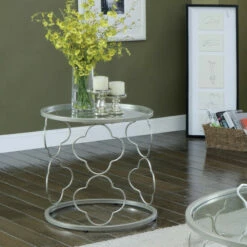 A tale of delicate artistic design plays out in a contemporary living space when the Jenn modern round metal end table serves as a central focus. From Furniture of America, this delightful end table becomes a primary decor feature with its charming style and light essence. Enjoy a novel round silhouette in a sturdy frame fashioned from light champagne finish metal. Panels of open metalwork forming quatrefoil elements join the round tabletop and open base, creating just enough airy, open space to make a room look larger. A sheet of strong, clear tempered glass forms its circular top, providing a surface with space for display. This chic end table is worth a second look.