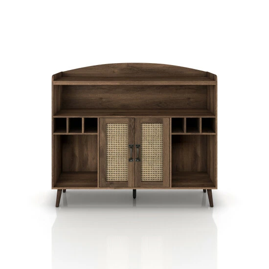 Save space in your dining room or create a handy bar space with this buffet table. This buffet features an array of open shelves, six wine slots, and two cabinet doors with bamboo webbing on the face. The distressed walnut finish pairs well with a wide variety of decor styles.