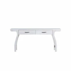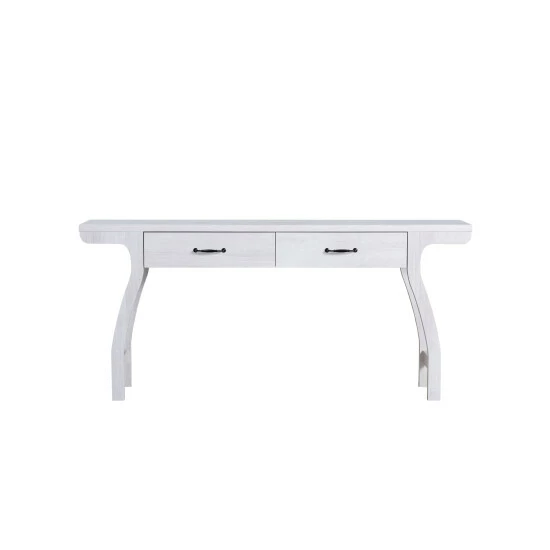 Stash away keys and mail in this convenient contemporary console table. The white oak entryway table greets you with a curved silhouette. Classic black bar pulls welcomes you to open the two drawers on smooth metal glides.