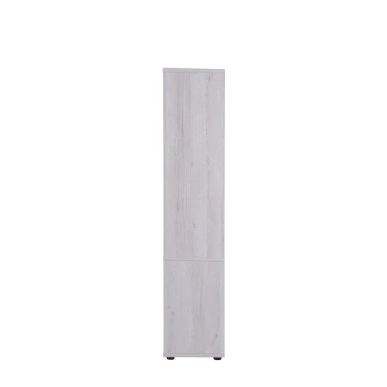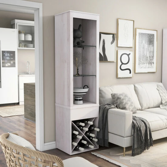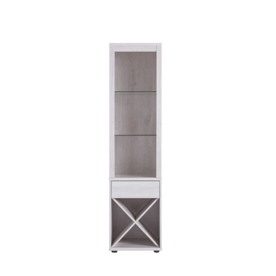 Modern brilliance gives this white oak curio a unique character. An LED light highlights family heirlooms to display on the two glass shelves. A modest drawer is a good place to hold accessories that you’ll need for any wine bottles you choose from the lower wine rack. Additional storage surfaces that can be used are the shelf above the drawer and, when the X-rack is removed, a lower shelf.