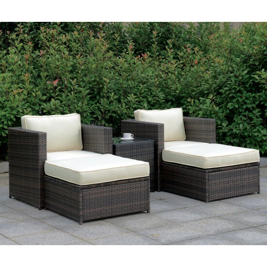 This weather resistant five-piece patio set is designed to create a unique seating arrangement. It offers comfortable cushioning with its two armchairs and two ottomans, wrapped in durable polyester canvas that’s easy to clean. Supported on a sturdy platform base, this brown and beige set is UV and water resistant with a faux rattan and aluminum frame. Enjoy the convenience of a tempered glass tabletop for setting drinks.