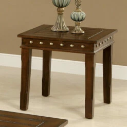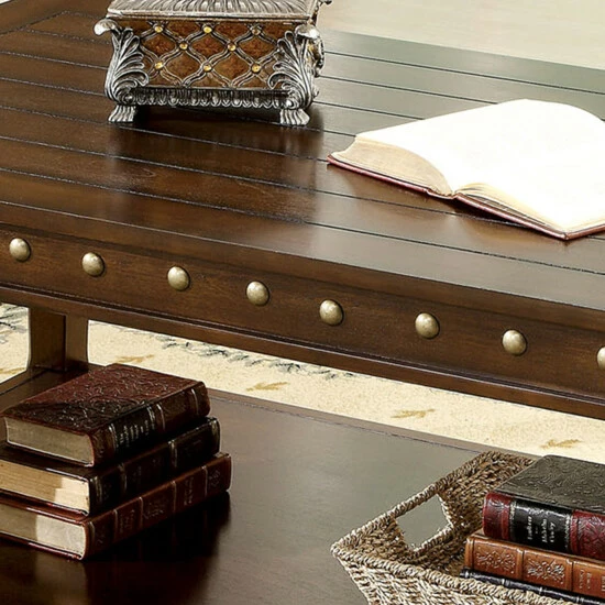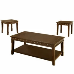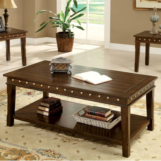With a luxurious walnut finish, the Jiff traditional three-piece accent table set adds rich, quality aesthetics to a transitional living space. This set from Furniture of America focuses on detailing to embellish a classic build with charming upgrades. Built from solid wood with veneer accents, its two-level coffee table design adds a lower shelf providing ample space for display and storage. All tables feature a plank-style top with an overhang, and carefully placed nail heads around recessed aprons. Angled legs taper at the top and bottom, adding to a sleek profile. Choose this accent table set to enhance the rich feel and delightful transitional motif of a living room or family entertaining space. Set includes a rectangular coffee table and two square end tables.