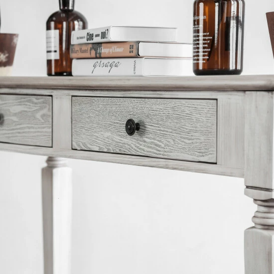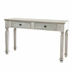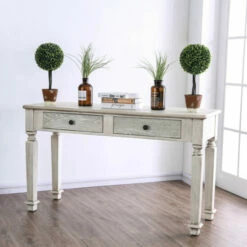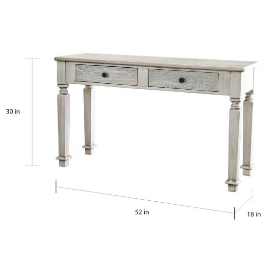 Tasteful styling contributes to the sophisticated appeal of the Joby country white solid wood sofa table. This impressive sofa table from Furniture of America is ideal for a transitional or traditional living space, delivering a hint of country flavor with farmhouse charm. Solid wood and wood veneer construction yields a sturdy table with design upgrades. With a weathered antique white finish, its natural woodgrain accents stand out to offer an earth-inspired aesthetic. Enjoy a spacious top surface as well as storage space in two roomy felt-lined drawers. Ornate carved wood details along leg units tell the story of an artisan approach to furniture design.