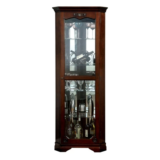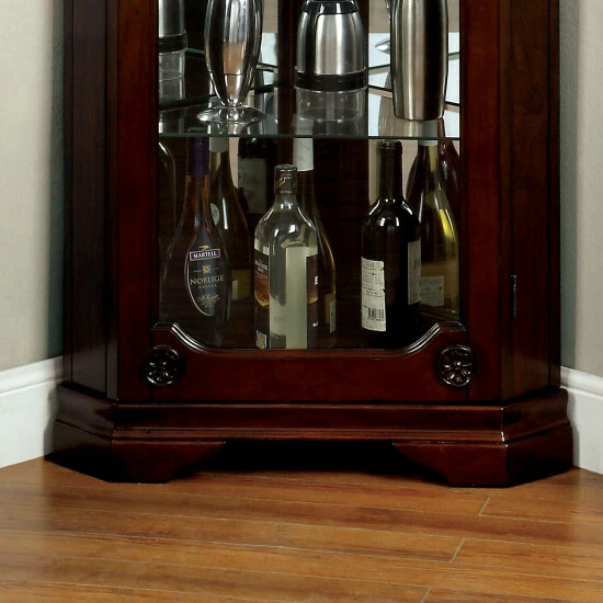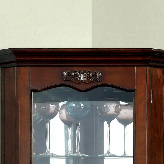 Bring elegance and appeal into your home with this traditional solid wood curio cabinet from the Furniture of America collection. Built from solid wood and wood veneers in a warm walnut finish, this cabinet is crafted with distinguished carved details that accentuate the design. A gorgeous framed glass door opens up to five glass paneled shelves featuring 5mm tempered glass.