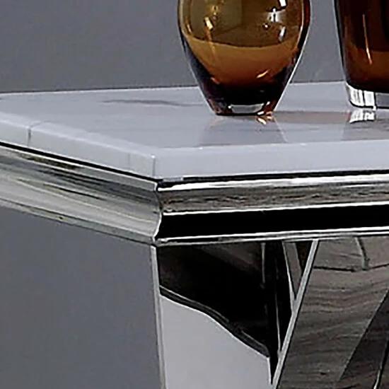 Perfect for your glam living space, this chic end table features a beveled faux marble top paired with a V-style pedestal. Metal construction with a chrome finish adds a subtle shine to match your modern decor.