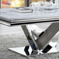 Perfect for your glam living space, this chic coffee table features a beveled faux marble top paired with a V-style pedestal. Metal construction with a chrome finish adds a subtle shine to match your modern decor.