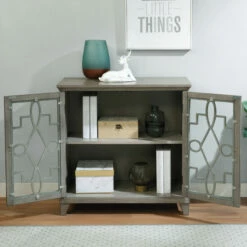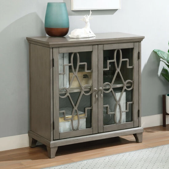 Inject a little character and charm into your living space with this hallway cabinet. Delivering versatile style with an elegant edge, the cabinet boasts a champagne finish with gold undertone. The cabinet boasts glass doors with intriguing overlays that adds dimension and richness in any room. Inside, two shelves add plenty of space for books, accessories, and other items.