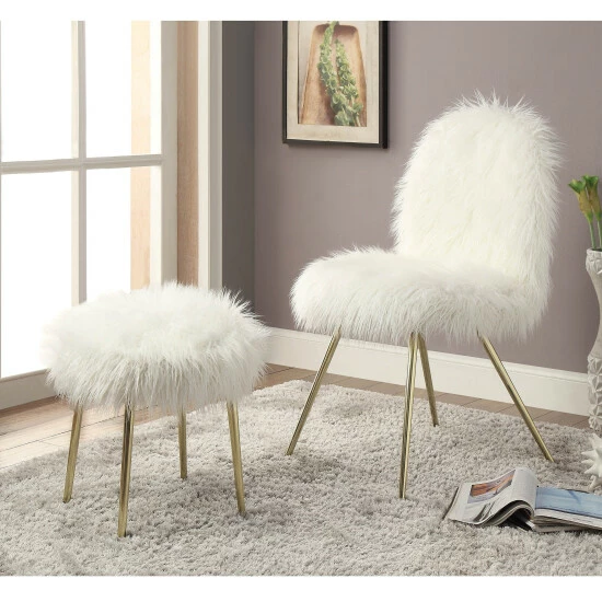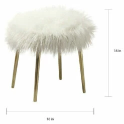 Give your bedroom a shabby chic touch with this white faux fur ottoman. It will immediately become the focal point and a conversation piece in any room. With gold-finished legs, you’ll have a glam vanity or desk seat. The flared legs only add to the charm of this delightful stool, which makes a beautiful addition to your make-up or study space.