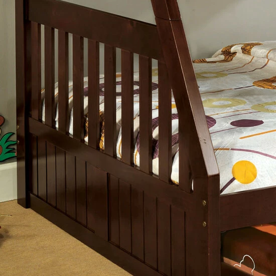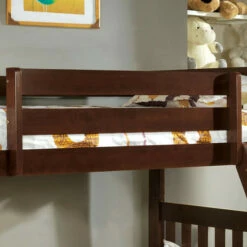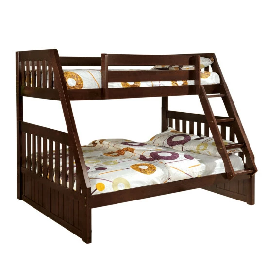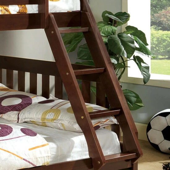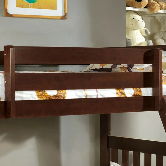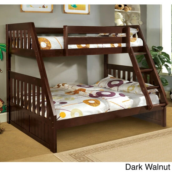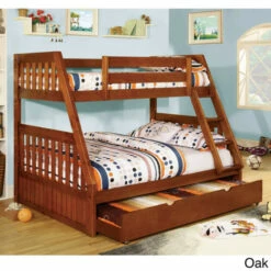 Enjoy a good night’s sleep with a beautiful and well-designed bunk bed, made by Furniture of America for the Kerc collection. This space saving bunk bed features a full size bed on the bottom and a twin size bed on top. A patented insert and lock joint structure provides additional sturdiness. An angled ladder provides easy access to the top be while slat-style safety rails keep your kids safe and sound. Below, find room for an optional trundle bed or use it as storage for toys and more. Choose your favorite finish between dark walnut and oak for a custom touch to the bedroom.