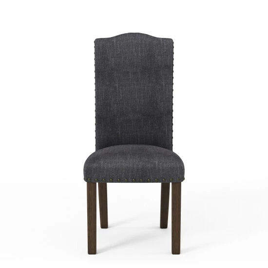 Modern comfort and pastoral stylishness highlight this transitional set of 2 side chairs from Furniture of America. The versatile design of these two tone chairs gives you the freedom to make use of them to suit your taste. They have solid wood frames crafted in a rustic walnut finish accented by handsome wood grain details and feature flax fabric upholstery (available in 4 different colors) and a tall camelback seatback design that makes it easy to sit back relax, and make great memories. Decorative nailhead trim and tapered solid block legs add an edgy touch to this transitional style set of chairs perfect for the dining room, living room, or entertainment room.