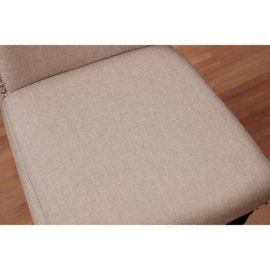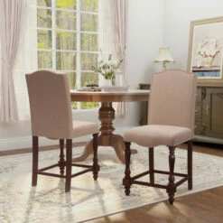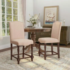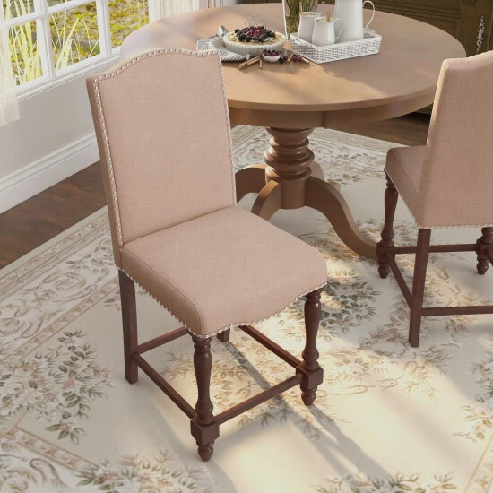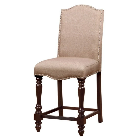 An exquisite design that will create a signature look for your dining area, these gorgeous, upholstered, counter height dining chairs are sure to impress your dinner guests. This elegant set of two chairs features smooth, linen-like upholstery over plush, comfortable, foam filled seats for a luxurious look and feel. A gleaming, nailhead trim border adds just the right touch of polish to make its design pop. The rich, antique cherry finish provides a beautiful contrast to the soft, ivory upholstery. Ornate, turned legs and graceful curves add traditional beauty to its classically elegant design. A matching table, bench, and dining server are also available, sold separately, for a complete ensemble that’s perfect for a formal dining room.