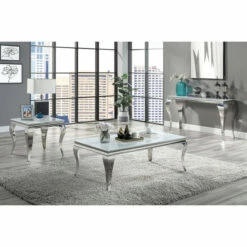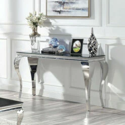 Embrace timeless curves blended with ultra-modern style in this charming, contemporary console table. Cabriole legs add a hint of drama to a tempered glass top and a gleaming silver finish that adds reflectivity and sophistication in any sitting area.