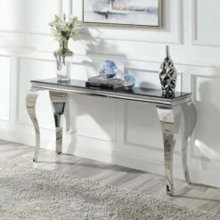 Embrace timeless curves blended with ultra-modern style in this charming, contemporary console table. Cabriole legs add a hint of drama to a tempered glass top and a gleaming silver finish that adds reflectivity and sophistication in any sitting area.