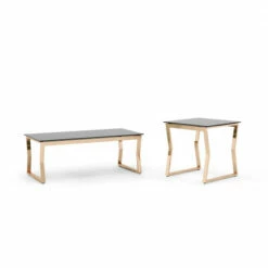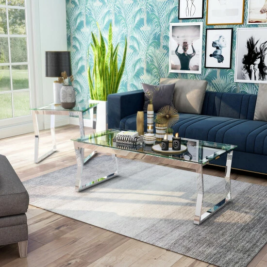 Elegant and glamorous, this two-piece coffee table set is bound to make an impression in your space. The angled table legs create an exceptional silhouette for this contemporary metal and glass coffee table and end table. Bring it into your living space to create an instant focal point.