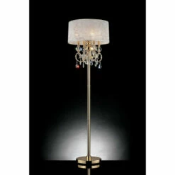 Adorned with glittering crystals of varied shapes and sizes, this gorgeous gold floor lamp is simply magnificent. Its sleek metal frame is topped with an elegant white shade etched with graceful floral designs.