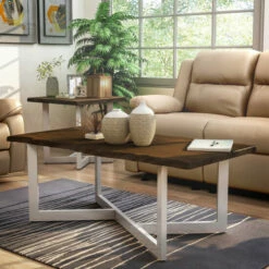 Update a transitional living room with a striking focal point that’s sure to draw the eye. This two-tone oak and white finish coffee table flaunts a spacious, rectangular tabletop with a classic live edge over a sturdy, white metal base crafted into crisp lines and angles. Enjoy drinks, snacks, board games, and casual lounging as you gather guests around this exquisite piece.