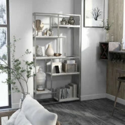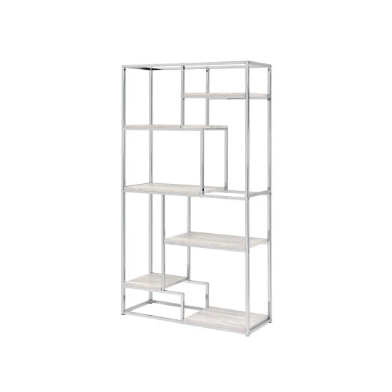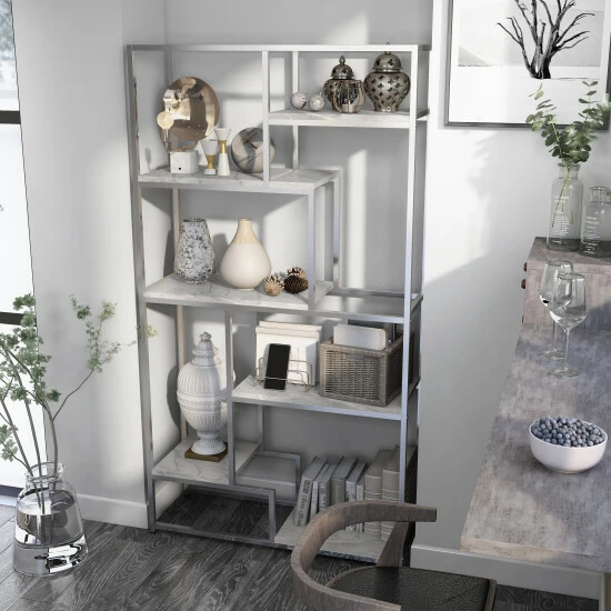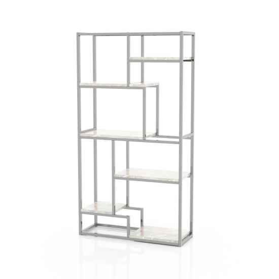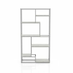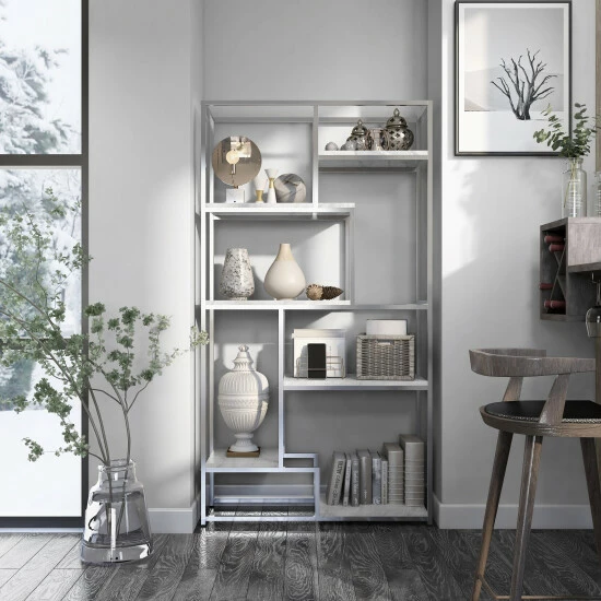 Sleek and unique, the steel construction of this shelf creates an eye-popping display. Six shelving units offer the perfect display area for your decor and prized possessions. With an in interesting geometric silhouette, it’s a sure bet that you’ll be pleased with its appearance and function.