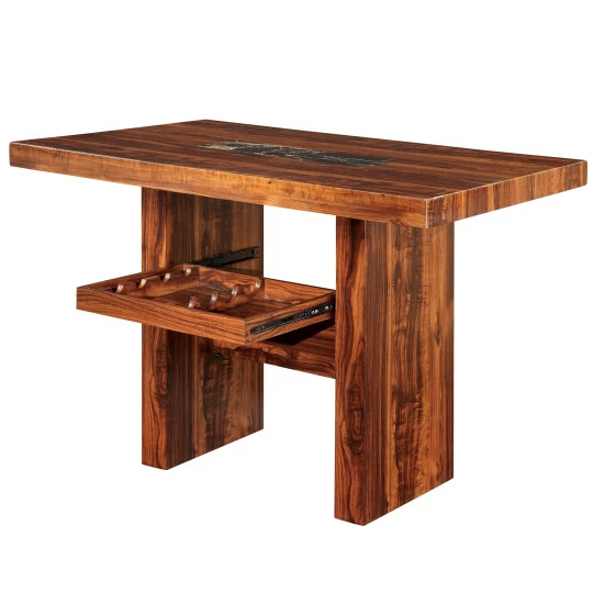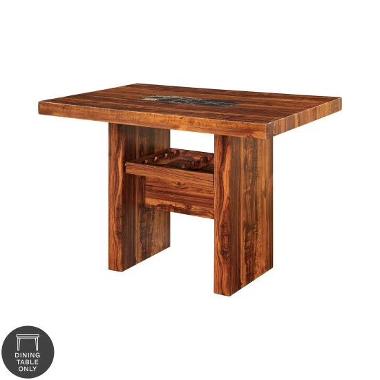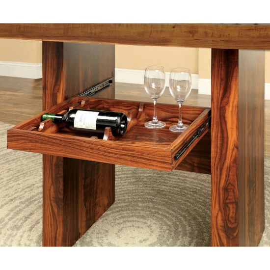 From the Furniture of America Kiva collection comes this modern counter dining table, perfect for adding an edgy, rustic design aesthetic to a contemporary dining space or entertainment area home bar. With a rectangular shaped tabletop accented with a marble-like centerpiece, this table features a striking deep brown cherry finish with a highly contrasted rosewood grain design. Resting on a trestle-style base with wide plank supports, this table also offers a convenient four-bottle wine rack situated in the base, which slides out by metal glides to choose and grab a bottle from your favorite vintner. Pair this dining table with matching counter height chairs from the same collection.