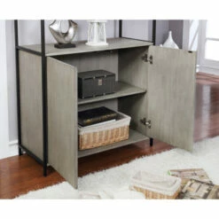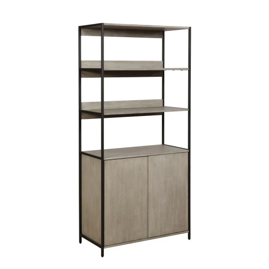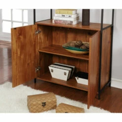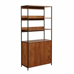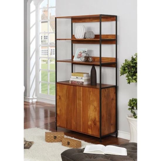 This three-tier shelf with a storage cabinet has enough shelving and space to store everything from leather-bound novels to candles and knickknacks. Made for the Kix collection, this piece is ideal for an office, living room, or storage room. Each bookshelf features a sandy black frame over MDF, Acacia veneer, and metal construction. The metal framing comes in a washed finish that gives it an attractive aged appearance. It provides a modern and contemporary feel and serves as an excellent solution for organizing your favorite collections, including its two cabinets to conceal your items. This is a tall three-tier bookshelf with storage standing at 72 inches high. Watch how it simultaneously transforms and organizing your living space.