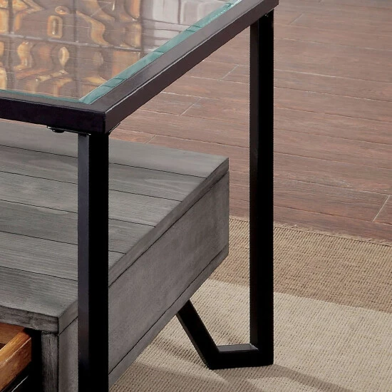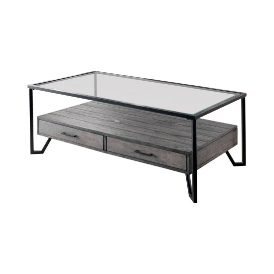 Inspiring industrial vibes tell the story of the Korz gray coffee table from Furniture of America. Position this rectangular coffee table in a casual living room or family living space to make room for storage, display, and serving. Engineered from MDF and plywood, its lower box cabinet unit receives a distressed gray finish and creates space in storage drawers with metal handles. Supported by a sleek, angular black finish metal frame, it offers a stunning contrast in a palette trending with modern designers. A tempered glass top gives the table a modern edge and sparkling brilliance. Choose this coffee table to embellish a design-forward industrial look with a hint of farmhouse charm.