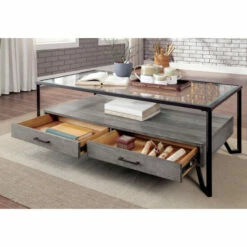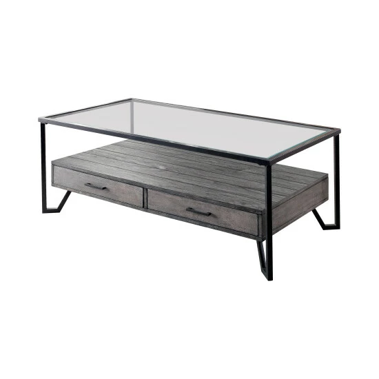 Inspiring industrial vibes tell the story of the Korz gray two-piece accent table set from Furniture of America. Position this set in a casual living room or family living space to make room for storage, display, and serving. Engineered from MDF and plywood, its lower box cabinet units receive a distressed gray finish and create space in storage drawers with metal handles. Supported by sleek, angular black finish metal frames, it offers a stunning contrast in a palette trending with modern designers. Tempered glass tops give the tables a modern edge and sparkling brilliance. Choose this set to embellish a design-forward industrial look with a hint of farmhouse charm.