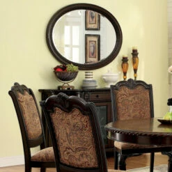 This traditional mirror dresses up your walls with its intricate carved trim and eye catching oval shape. The rich brown cherry finish imparts warmth to your environment with its deep red and brown tones.