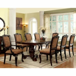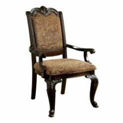 Elegantly formal with a design that is innately sophisticated, this extravagant set of two wood armchairs is sure to awe dinner guests. Beautifully traditional in style, this is a brown cherry armchair set with floral pattern upholstery. It’s padded on the cushion and backrest for comfort, allowing you to linger long after dinner with casual conversations. Nail head trim adorns the backrest with molding and engraving details enhance its style. These cherry armchairs are supported on lovely lion claw feet that will instantly bring compliments from guests. It’s time to play dress-up and start hosting those fancy dinner parties you’ve always dreamed of!