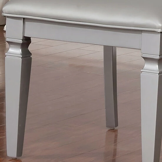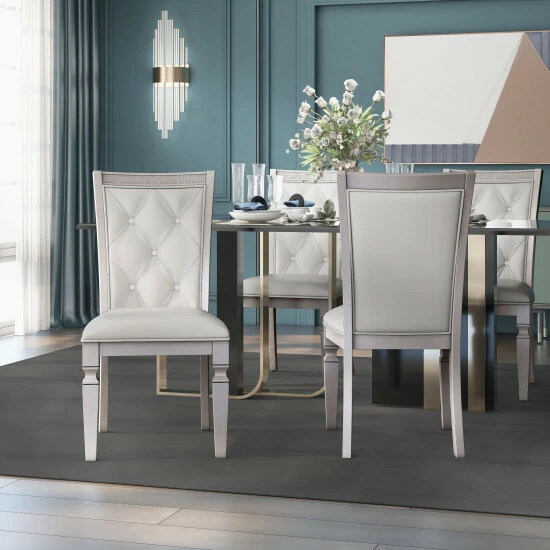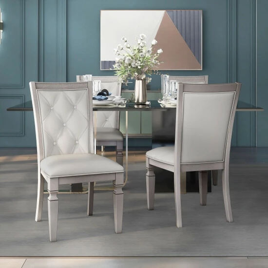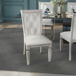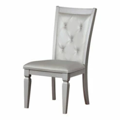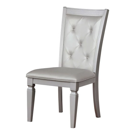 Give your home a touch of chic with this set of two contemporary side chairs. It’s fashioned from solid wood and wood veneers in a glitzy silver finish that lights up any room. Enjoy comfy seating on the cushion seat and button tufted back, with tapered legs in front and flared legs in back. This chair has the versatility to go in any semi-formal dining room or a living room when additional seating is necessary.