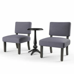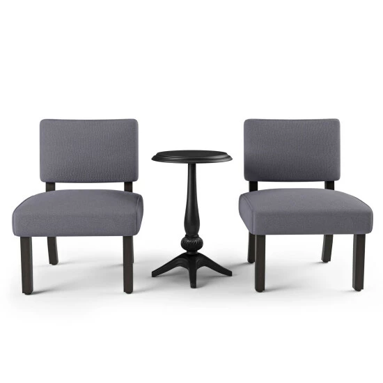 This simple, stylish three-piece living room set from Furniture of America, is the perfect way to entertain guests or enjoy a quiet chat with family. Wrapped in grey fabric upholstery, the two accent chairs feature comfortable, smooth wide seats and cradling back rests that provide generous support, with tapered front legs and angled back ones for style and support. The slim round side table complements the two chairs, offering ample room for a lamp, picture frame, or drinks. It also features a carved turned pedestal base for a timeless allure. This set makes an elegant addition at a window with a view in your living room, den, or sitting room.