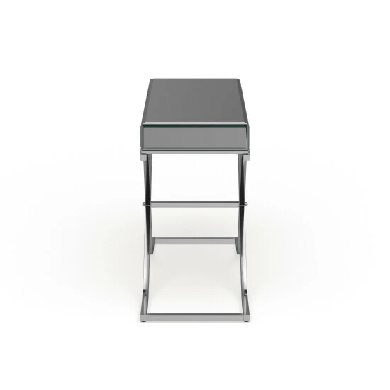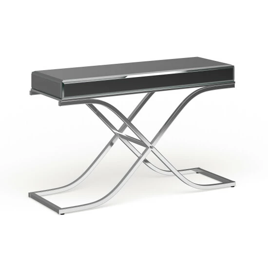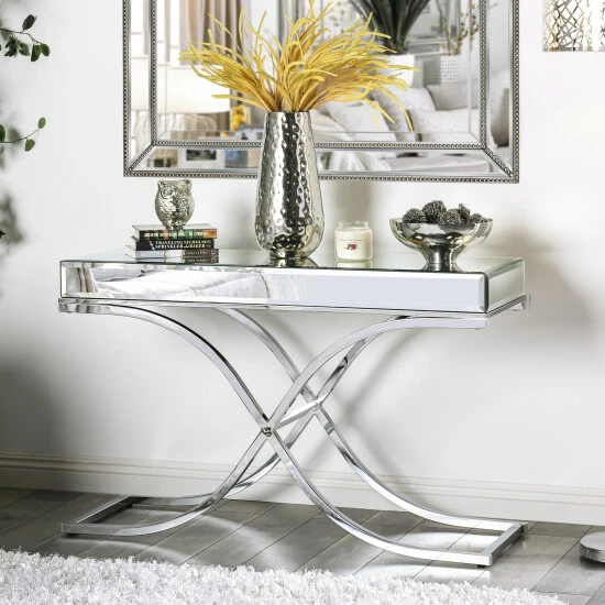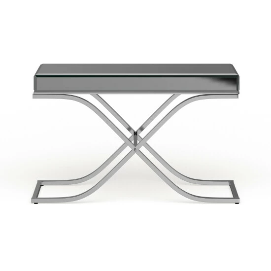 Metal can dramatically transform your living space and this glamorous accent sofa table is a prime example. The beautiful X-shaped curves create unique leg designs that steadily uphold the smoked mirror tabletops. The shape of this contemporary frame is ideal for accentuating the glistening chrome finishes of the metal tubing. The chrome finish gives this table set an outstanding design while making a lasting impression on guests of all ages. Carefully crafted from glass and metal, this is a durable sofa table that will stand the test of time. Use it to incorporate modern and contemporary elements into your transitional style living space.