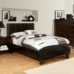 This low-profile Lala Modern Twin Platform Bed from Furniture of America will add contemporary style to your child’s bedroom decor. This twin bed is fully upholstered in faux leather and features solid wood construction for stability and durability. The headboard features vertical stitched accents to give it a modern, sophisticated look, so your child can use the bed for many years to come. The headboard is plushly padded, making it comfortable for use as a backrest while doing homework, reading a book or playing a video game. The bed is supported on tapered wood block feet for a tailored profile and is offered in multiple color options to complement any decor palette and lends itself well to any design style. The included European slat kit eliminates the need for a box spring foundation and is mattress ready at assembly.