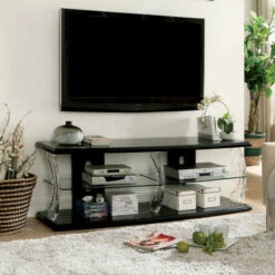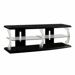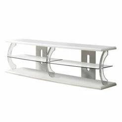 Match sleek with sleek when you add this contemporary TV stand from Furniture of America, which looks as clean and minimalist as the devices it houses. This modern media center features a variety of materials and design elements that will light up your space, from its curved acrylic supports to its high gloss lacquer finish to its softly illuminating LED lights. It’s constructed of glass, acrylic, and replicated wood, with the lacquer finish brilliantly reflecting the LED light. Four open shelves with 8mm tempered glass offer stylish storage, with cutout openings on the back supports for easy outlet access and cord concealment. This chic LED light TV stand will give your living room, den, or entertainment room a movie theater ambiance.